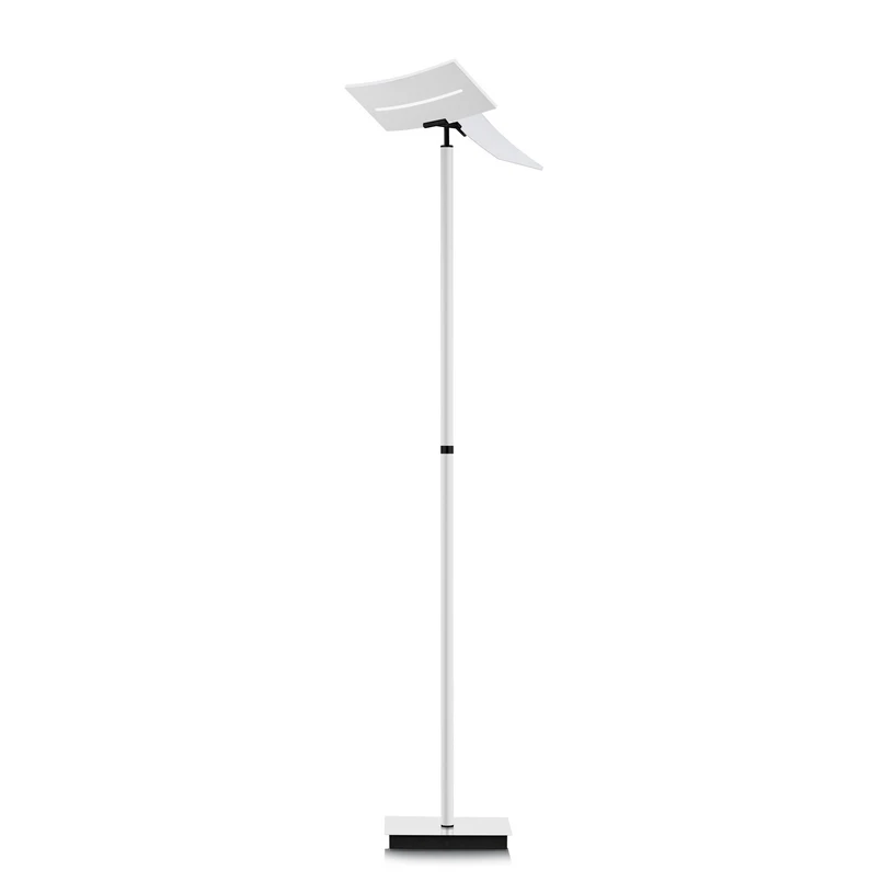 Evolo LED-gulvlampe med CCT-funksjon og dimmer Evolo er en på alle måter moderne LED-gulvlampe som gir lys som passer til enhver situasjon og aktivitet. De to rektangulære lyselementene, som er laget av metall i vinkelform, er på den ene siden utstyrt med lysdioder som lyser jevnt gjennom det opalhvite dekselet, mens lyset på den lukkede siden kun skinner gjennom en smal spalte. De to rektanglene kan justeres etter ønske, slik at lysutstrålingen kan varieres når som helst. Lysfargen kan justeres fra varmhvit 2700 K til dagslys med 6000 K, og lyset kan dimmes med trykknappen på rammen.