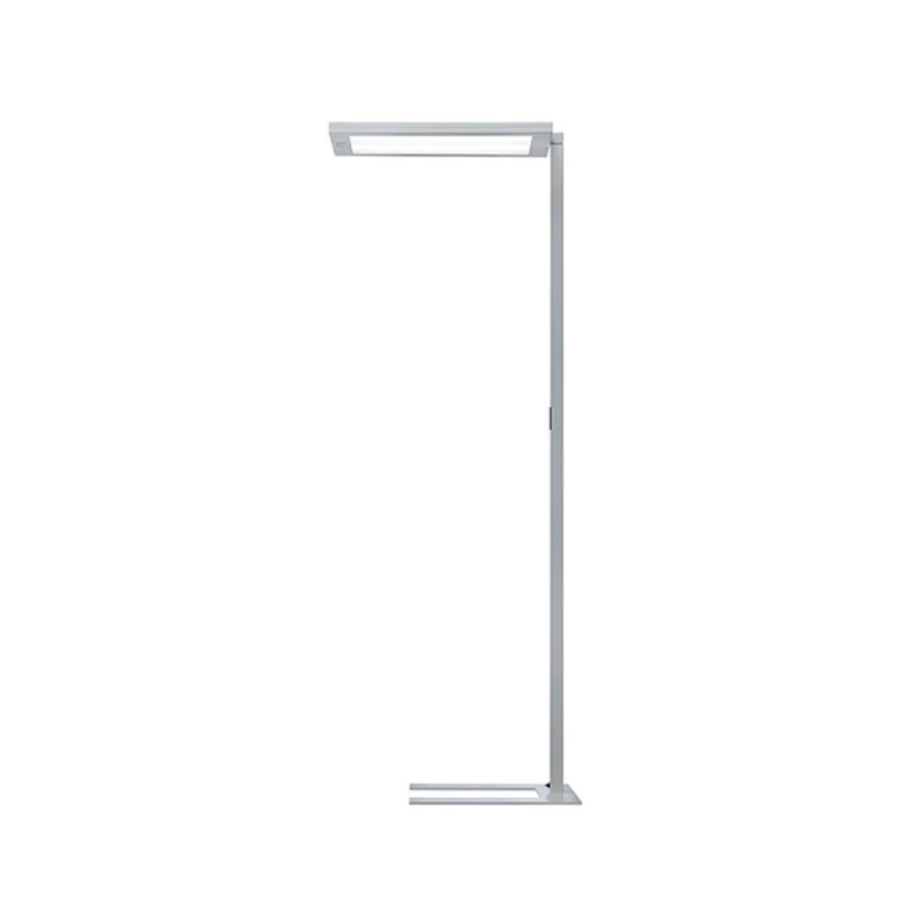 Lavigo DPS 14000/VTL/R/G2 LED-gulvlampe med sensorteknologi og biodynamisk lys Lyset i Lavigo LED-gulvlampe styres av den integrerte dagslyssensoren og en PIR-bevegelsessensor avhengig av dagslys og tilstedeværelse. Armaturen er utstyrt med et integrert, autonomt lysstyringssystem som automatisk regulerer intensiteten og fargetemperaturen til det indirekte lyset ved hjelp av en definert, tidsavhengig styringskurve. Dette er basert på naturlig dagslys og harmonerer dermed med menneskets biologiske rytme. Kontorsteglampen i stål med metallisk sølvlakkert overflate har en skjerm i satinert akryl. Takket være en konisk prismatisk skjerm oppfyller Lavigo kravene til bruk ved dataarbeidsstasjoner. Edgelight- og Lightguide-teknologien sørger for et homogent direkte lys, mens den multifunksjonelle trykknappen på armaturstativet gjør det mulig å justere direkte og indirekte lys individuelt og separat. Den flate armatursokkelen kan også enkelt skyves inn under skrivebordet - Avblending: UGR <= 10 - Lysfordeling: 12 % direkte, 88 % indirekte lys