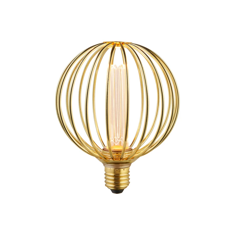 Globe Filament LED-pære med E27-sokkel, 3,5 W, 1800 Kelvin, dimbar Globe LED-pære for E27-sokkel har et sfærisk, gullmalt stålbur. Glødetrådene på innsiden er omgitt av glass. Globe avgir varmhvitt lys og kan dimmes eksternt.