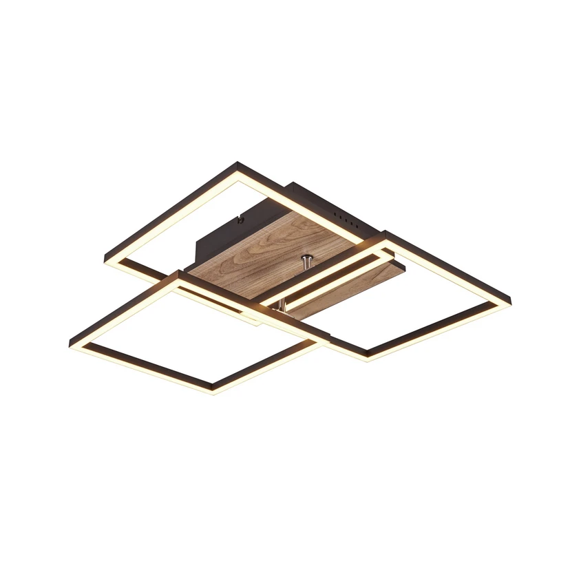 Allsidig LED-taklampe Mobile i treutseende med tre firkantede lyselementerTaklampen Mobile er spesielt fleksibel når det gjelder design og lyseffekt. Den har tre horisontalt svingbare, firkantede rammer som på undersiden er utstyrt med lysdioder. Disse gir direkte belysning som kan justeres i lysstyrke og fargetemperatur avhengig av sted og situasjon. Den vinklede baldakinen er utstyrt med et deksel av trefiberplate med middels tetthet, hvis treutseende gir LED Mobile taklampe et naturlig utseende- Levering inkluderer fjernkontroll: trinnløs dimmefunksjon, CCT-fargeskift (varmhvit til dagslys), nattlys- Switch-dim: kan dimmes i tre trinn (100 %, 50 %, 25 %) via vanlig veggbryter- Minnefunksjon: den sist valgte innstillingen er tilgjengelig igjen etter innkobling- Kan også brukes som vegglampe