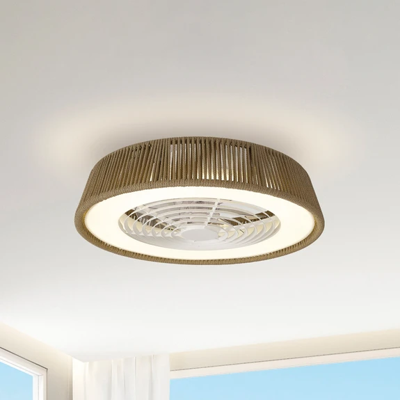 LED-takviften Polinesia Nautica kombinerer en forfriskende luftstrøm med moderne generell belysning. Rotoren ligger inne i den runde kroppen, som er kledd med brune tekstilstrenger på utsiden. Undersiden er utstyrt med LED-er bak et satinert deksel. Lyset kan dimmes og fargetemperaturen kan reguleres. Betjeningen skjer med den medfølgende fjernkontrollen.