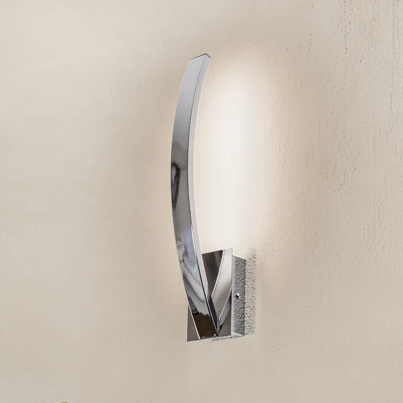 Umbra vegglampe kombinerer perfekt moderne design og en behagelig lyseffekt. Lysdiodene er festet på baksiden av den skinnende stripen i kromutseende som strekker seg opp fra den rektangulære veggbraketten og lager en subtil kurve mot veggen på spissen. Sistnevnte reflekterer lyset fra lysdiodene inn i rommet, slik at indirekte grunnbelysning oppnås. En fjernkontroll for å bytte og dempe vegglampe er inkludert i leveransen.