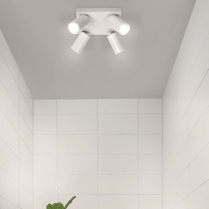 Octagon LED-takspotlight, fireflammers, firkantet, dimbar Octagon er en firkantet LED-takspotlight med fire dreibare og svingbare spotlights. Den er laget av stål med matt overflate og leveres med dimbare GU10 LED-lamper. De fire spotlightene kan roteres og svinges for å rette lyset mot ulike deler av rommet. LED-spotlightene i Octagon-serien kjennetegnes av tidløs design, stålhus av høy kvalitet med matt overflate, allsidig bruk og lang levetid takket være utskiftbare lyskilder - dimbare OSRAM LED-lamper inkludert - enkel installasjon - komplett installasjons- og tilkoblingstilbehør inkludert.
