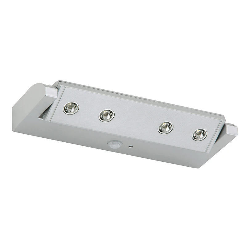 Lero - den dreibare, batteridrevne LED-underskapslampen Den enkle LED-underskapslampen Lero med fire flammer er ideell for kortvarig belysning i mørket. Den innebygde lys-/mørkesensoren registrerer automatisk om det er behov for lys eller ikke, basert på de rådende lysforholdene. Den integrerte bevegelsesdetektoren registrerer personer og slår på lyset i et halvt minutt ved bevegelse. Innenfor en rekkevidde på tre meter registrerer Lero alle bevegelser i en vinkel på 80° til 100°. Underskapslampen Lero kan drives med batterier eller ved hjelp av nettadapteren. Lysdiodene er allerede fastmontert ved levering og avgir et nøytralt hvitt lys. I utgangspunktet er alle interiører egnet som brukssteder.