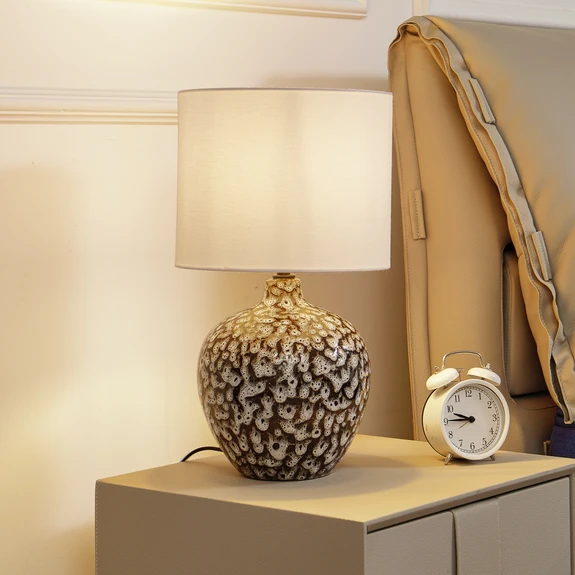Dekorativ Thalassia-bordlampe med mønstret keramikkfot Thalassia-bordlampen består av en keramikkfot og en linskjerm. Kombinasjonen av materialer og farger skaper en spesielt harmonisk effekt og gjør lampen til et vakkert blikkfang, selv når den er slukket. Den lyse linskjermen gir et blendingsfritt og varmt lys til omgivelsene. Den mønstrede sokkelen skaper en dekorativ aksent i oppholdsrommet. Bordlampen slås av og på ved hjelp av en bryter på ledningen. Thalassia kan med fordel brukes som lyskilde i gangen eller i stuen.