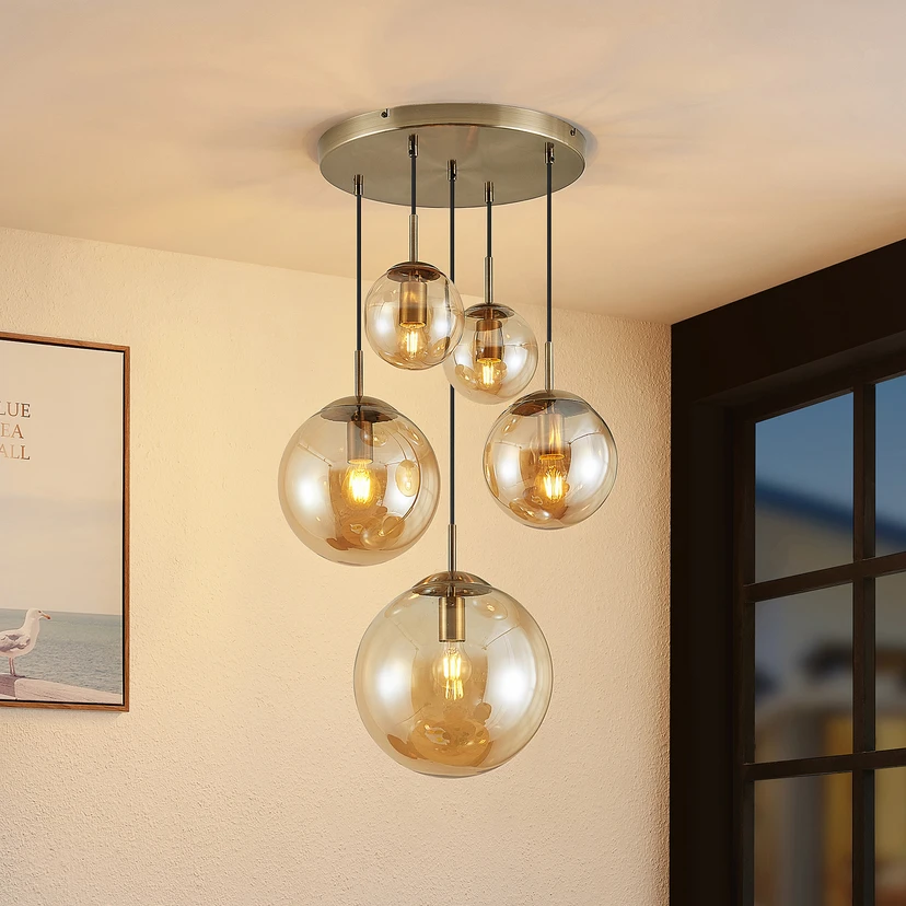 Fem ravfargede glasskuler i ulike høyder og størrelser - pendellampen Teeja til stuen Denne pendellampen laget av glasskuler gjør ikke bare et vakkert inntrykk på betrakteren, men skaper også en vakker lyseffekt som er veldig varm og koselig. Det skyldes først og fremst det ravfargede glasset i kulene, som har en veldig koselig fargetone og samtidig ser vakkert og innbydende ut. Pærene er alltid godt synlige bak det klare glasset og er derfor en del av helhetsinntrykket, så de bør velges slik at de passer til uttrykket, og filamentpærer er en god anbefaling, spesielt siden disse vanligvis er utstyrt med effektive LED-lamper. Kulene henger fra det runde takfestet i forskjellige høyder for mer dynamikk og individualitet og har også forskjellige diametre. I stuen er pendellampen ideell som lyskilde over sofaen eller spisebordet.