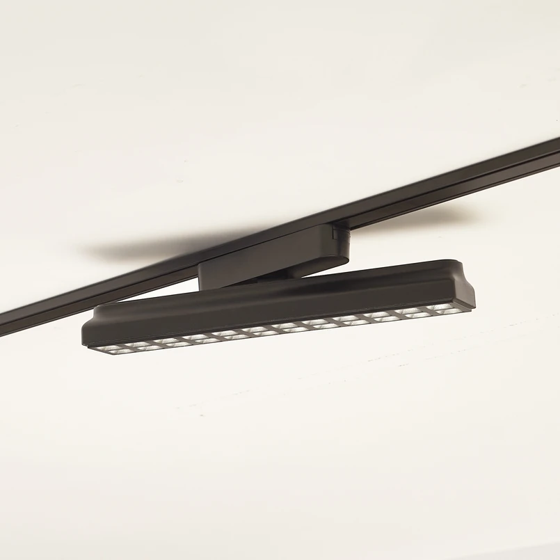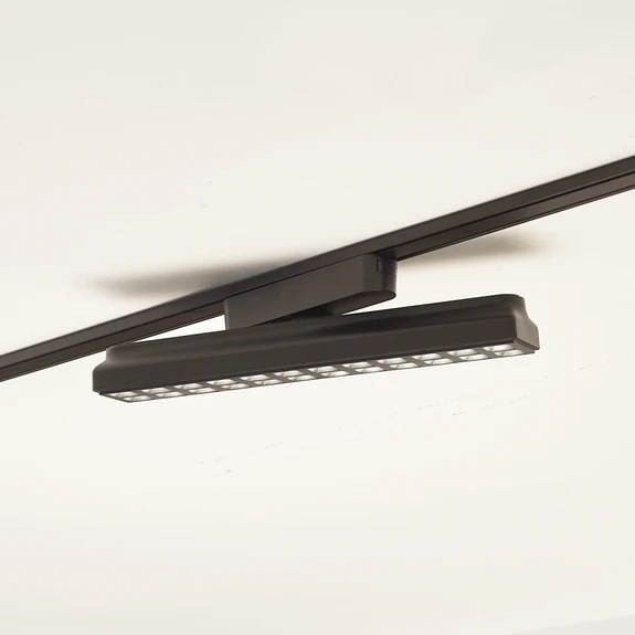 Lumaro LED-armatur i svart plast - kan kombineres med skinnesystemet med samme navn Lumaro LED-armaturen kombinerer funksjonalitet med stilren design. Som kantet armatur med integrert LED-lyskilde har den en regulerbar lysfarge (CCT) og en dimbar funksjon som gjør at lysfargen og lysstyrken kan justeres etter behov - fra varme til kjølige toner. Denne funksjonen er spesielt fordelaktig i rom der det er behov for å variere stemningen, for eksempel i stuen, spisestuen eller gangen. Både CCT-funksjonen og dimbar-funksjonen styres ved hjelp av en fjernkontroll, som ikke følger med, men som kan kjøpes separat via tilbehøret. Lumaro LED-skinnesystemet kan integreres i skinnesystemet med samme navn og gir en ukomplisert og enkel installasjon. Den byr også på utallige designmuligheter med ekstra skinn- og belysningselementer som gir maksimal fleksibilitet og kan utvides i ettertid - Armaturens lampehode kan roteres 90° - Må kombineres med 48 V Lumaro LED-driver for å fungere Vær oppmerksom på at Lumaro skinnesystem kun er kompatibelt med tilbehør fra Lumaro-serien. For å unngå forveksling med andre systemer, må du kun kombinere tilbehør og skinnesystemer fra serien med samme navn.