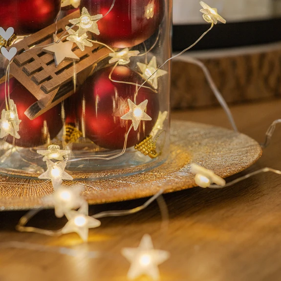 Motje LED-lyskjede med stjernelyskilder - perfekt for en festlig atmosfære Denne LED-lyskjeden med 30 lyskilder i stjernedesign er et magisk tilskudd til juledekorasjonen. Takket være den batteridrevne funksjonen kan du plassere lyskjedene fleksibelt innendørs uten å måtte bekymre deg for en stikkontakt. Stjerne-looken på lyskasterne er unik og setter et spesielt preg på julepynten. Skap en festlig atmosfære i hjemmet med denne LED-lyskjeden, og trollbind gjestene dine med det fortryllende stjernelyset.
