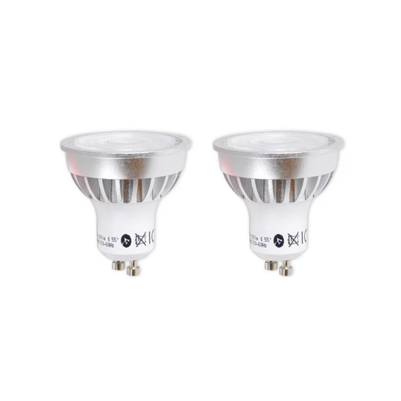GU10 5 W LED-reflektor i et praktisk sett med 2 stk. Denne reflektoren imponerer med flott og tidløs design og er svært energibesparende takket være den nyeste LED-teknologien. Reflektoren er en pålitelig og langvarig lyskilde som avgir et varmt hvitt lys på 3 000 Kelvin i opptil 20 000 timer. Med et lavt wattforbruk på 5 watt kan denne LED-lampen erstatte konvensjonelle halogenreflektorer på opptil 45 watt. Takket være designen og en 55° spredningsvinkel egner reflektoren seg både til hjemmebruk og til belysning av butikklokaler, utstillingsvinduer, museer eller til aksentbelysning i hotell- og restaurantbransjen. Egenskaper: - har en effektfaktor på 0,5 - kan ikke dimmes - avgir et varmt hvitt lys i ca. 20 000 timer - inneholder ikke kvikksølv - reflektoren krever ingen oppvarmingsfase (1 sekund til 100 % lysstyrke) - vedlikehold av lampens lysstrøm ≥85 % ved 75 % av gjennomsnittlig levetid - leveres i et praktisk sett med 2 stk