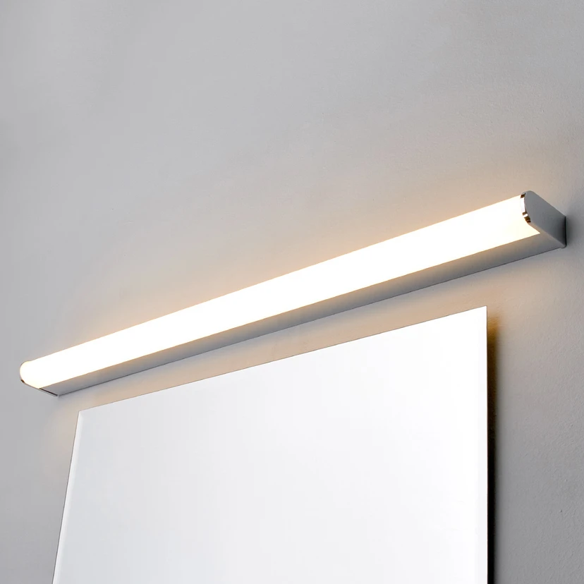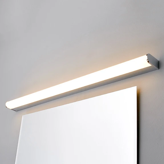 Philippa - LED-vegglampe til badet LED-vegglampen Philippa er designet for bruk på badet, der den kan monteres over et speil for å belyse det og speilbildet jevnt. Akryldiffusoren er opalhvit og kompletteres av blanke kromdetaljer på sidene og baksiden. Dette er naturligvis en perfekt match for moderne interiør.