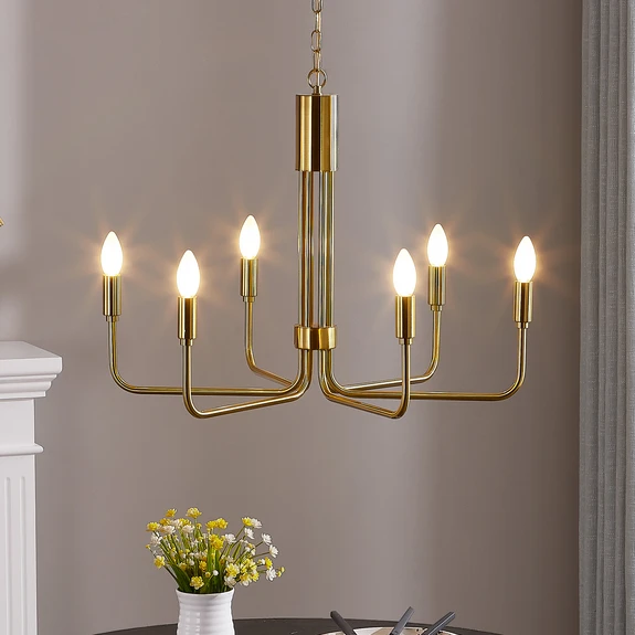 Elegant Elanova lysekrone som et elegant stuetilbehør over spisebordet Elanova er en elegant lysekrone helt i jern. Den har seks oppoverbøyde lampearmer og er dekorert med en overflatefinish i en sofistikert messingfarge. På denne måten gir den et sofistikert uttrykk til stuen og gjør seg godt i stue- og spisestuen, for eksempel over spisebordet. Selv når den er slått av, er denne lysekronen et skikkelig blikkfang.