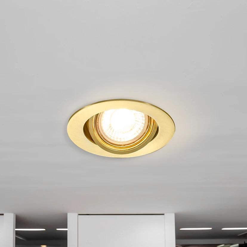Golden Sunil innfelt spot i aluminium Denne spotlighten setter nye aksenter i interiøret ditt. Lampen lar deg justere lysstyrken etter eget ønske ved hjelp av en ekstern dimmer (ikke inkludert). Den har et vakkert design og integreres effektivt i alle oppholdsrom. Lampen er designet for bruk med pærer med GU10-sokkel. Den er laget av aluminium. Lampen i fargen gull kombinerer alle kvalitetene og særtrekkene som kjennetegner varemerket Lindby. Den passer perfekt inn i interiørstilen din og skaper en flott og koselig atmosfære. I tillegg kan hodet på spotlighten svinges 30°.