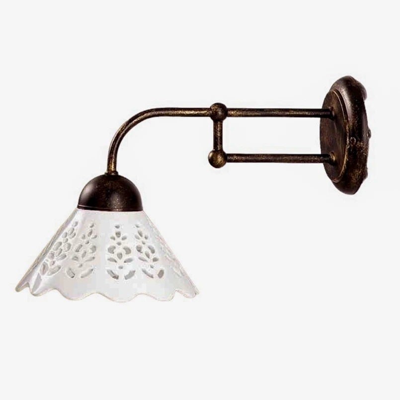 Delikat vegglampe I Portici for fin tilleggsbelysningDen sjarmerende vegglampen I Portici fortryller med sin romantiske keramiske lampeskjerm i hvitt. Den er buet i kanten og har et interessant hullmønster. Fine blondekanter leder tankene hen på betrakteren. Glasuren fremhever også den keramiske skjermen med blanke effekter. Den lille dekorative veggholderen er laget av metall med bronsefinish. I Portici gir vakkert ekstra lys i en smakfull atmosfære.