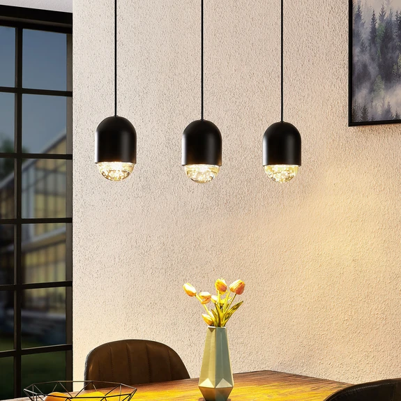 Amielle er en pendellampe med et spesielt moderne utseende . De tre nyanser er nesten elliptiske i form og laget av svart metall i den øvre delen, mens de nederst ender med et glasselement med en boblestruktur inni. Dette skaper ikke bare et flott, veldig moderne utseende med en puristisk effekt, men også en unik lyseffekt som er ledsaget av en viss gnist. Den langstrakte stangformen med de tre hengende nyanser i svart gjør Amielle til en flott lyskilde for spiseplassen, som ikke bare er sterkt opplyst, men også stilig opplyst med denne elegante pendellampe.