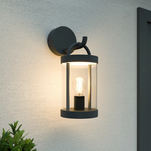 Cassian utendørs vegglampe i moderne lanterneform Den moderne designen til Cassian utendørs vegglampe imponerer ved første øyekast. Den enkle lykteformen med glassdiffusor har en E27-fatning innvendig, der det fortrinnsvis skal settes inn en dekorativ LED-filamentpære. Lyset kan sendes jevnt og allsidig gjennom glasset, noe som gir et sterkt og trygt lys i mørket. Takket være den robuste konstruksjonen og den høye kapslingsgraden er Cassian egnet for mange utendørs bruksområder.