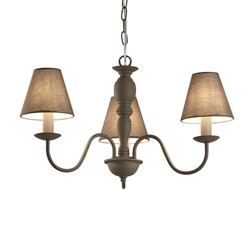 lysekrone Fatima har en buet stang som minner om bølgespor. Bunnmaling av stålelementene er grå, det samme er stoffet i nyanser. Den er ideell som spisebordbelysning, med de tre stoffskyggene vendt oppover og lyset flommer derfor veldig behagelig i rommet og bidrar dermed til større komfort. For å belyse bordet på en energibesparende måte, kan moderne LED-lamper brukes i E14-kontaktene i tillegg til glødelamper opp til 40 W.