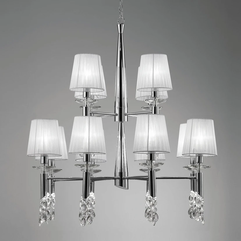 Designerlysekronen Lilja - en imponerende fremtoning Moderne design forbindes ofte med kjølig tilbakeholdenhet. Den overdådige lysekronen Lilja av designeren José Ignacio Ballester viser at dette ikke trenger å være tilfelle, og at moderne rom kan forvandles til veritable festsaler som kombinerer prakt og moderne struktur i en perfekt symbiose. På den ene siden er det overfloden av materialer med gjennomskinnelige silkeskjermer, skinnende forkrommede halogenlamper og krystallpendler som glitrer i lyset, og på den andre siden det klare, nivådelte uttrykket.