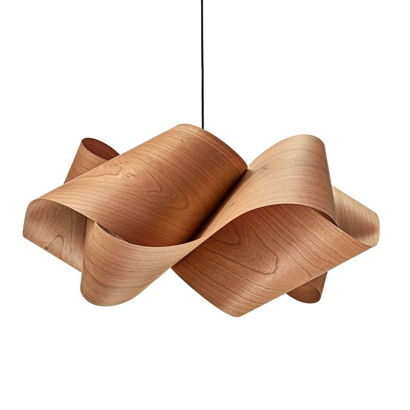 Swirl pendellampe - organisk buet form i trefinér Swirl pendellampe er utformet som en virvel av sammenflettede bånd i trefinér. Når armaturen slås på, blir treets fine årer enda tydeligere, og de presise konturene skaper et spennende spill av lys og skygge. Med sin sjelfulle karakter og tilstedeværelse vekker Swirl-pendellampen øyeblikkelig oppmerksomhet og er et naturlig innslag i ulike interiørkonsepter. Swirl er designet av Ray Power og er et godt eksempel på den irske designerens tilnærming til å skape tredimensjonale former av tynne lag. Trefinéret er formet til sin tynne, elastiske og overskridende form ved hjelp av Timberlite®-prosessen hos produsenten LZF-Lamps. Swirl-pendellampen har allerede blitt tildelt Good Design Award i Chicago og German Design Award Special i 2017 - med tre fra bærekraftig, miljøvennlig skogbruk (FSC®-sertifisert)