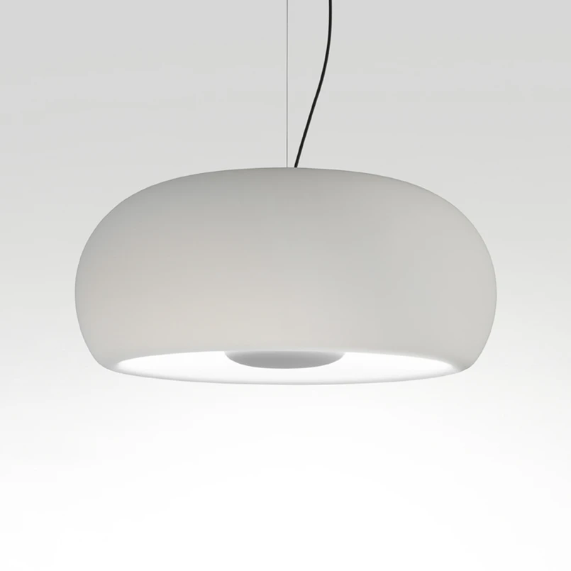 Indirekte lys par excellence: Vetra LED-pendel i glass med SMD-LED, 2700 K Den elegante Vetra LED-pendelen henger fra den svarte baldakinen via et ståltau som den svarte tilkoblingskabelen løper langs. Den ble skapt i 2018 av Joan Gaspar, en flerfoldig prisbelønt industridesigner som blant annet er kjent for å gi nytt liv til armaturer med konvensjonelle former, og som har samarbeidet tett med MARSET siden 1996. Vetras interiør skjuler mer funksjonalitet og kreativitet enn man først skulle tro på grunn av den ganske klassiske formen: Den voluminøse skjermen av munnblåst glass, med sidevegger som lukker seg om seg selv, fungerer som en diffusor på siden og slipper lyset diskret gjennom. LED-modulen, som består av SMD-lysdioder av høy kvalitet, er montert over en stang på høyde med den nedre kanten og er rettet innover. Holderen av lakkert aluminium fungerer også som en diffusor, slik at lyset ikke sendes direkte nedover og dermed ikke blender. I stedet reflekteres lyset inne i lampeskjermen, noe som mangedobler lysstyrken og gir en meget god, indirekte belysning.
