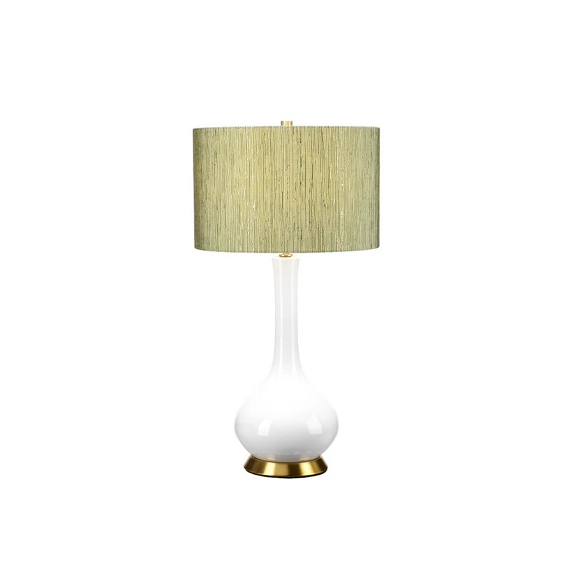 Milo bordlampe med keramikksokkel og stoffskjerm Milo bordlampe setter et fargerikt preg på rommet. Sokkelen er laget av blank, hvit keramikk med en dekorativ metallring i bunnen, mens den sylinderformede skjermen er laget av stoff med vakker tekstur og mønster. Lyset slås av og på med bryteren som er integrert i ledningen