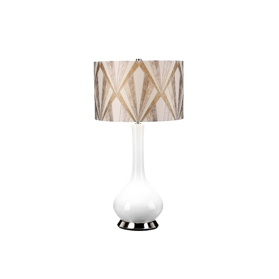Milo bordlampe med keramikksokkel og stoffskjerm Milo bordlampe setter et fargerikt preg på rommet. Sokkelen er laget av blank, hvit keramikk med en dekorativ metallring i bunnen, mens den sylinderformede skjermen er laget av stoff med vakker tekstur og mønster. Lyset slås av og på med bryteren som er integrert i ledningen