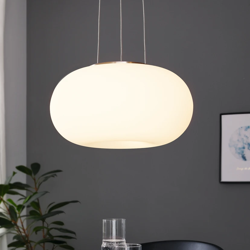Stilig Optica pendellampe med rund glasskjerm Med sin smakfulle, enkle design passer Optica taklampe til moderne innredningsstiler og setter et stilig preg på ethvert rom. Formen på den runde, hvite glasskjermen sørger for en jevn og behagelig belysning av bruksområdet. Rammen har en matt nikkelfinish og kompletterer taklampens moderne, elegante utseende.