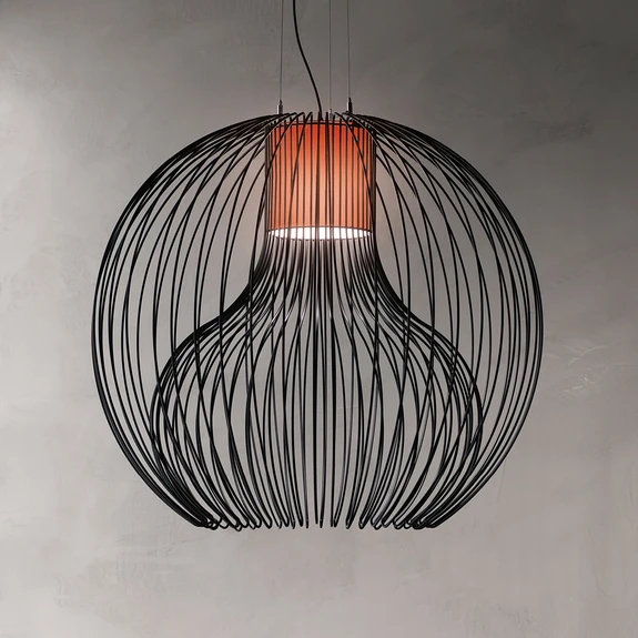 Icaro Ball-pendellampe i slående design av Brian Rasmussen Icaro Ball-pendellampen er et dekorativt høydepunkt selv når den er slukket. Det skyldes først og fremst lampeskjermens design: Skjermen består av to ulike former som er flettet inn i hverandre. På utsiden er metallstenger plassert rundt og danner en kuleform, mens innsiden - med utgangspunkt i sokkelen - er formet som en pære. Begge formene er synlige for betrakteren gjennom hullene mellom stengene. Et tredje, dekorativt aspekt er den lille stoffskjermen rundt den innsatte lampen, som sørger for at lyset avgis uten å blende. Stoffskjermen følger ikke med Icaro Ball, men kan kjøpes separat i flere farger via lampens tilbehør. Med Icaro Ball har den danske designeren skapt et belysningsobjekt som passer perfekt inn i sortimentet til den italienske belysningsprodusenten Modo Luce, hvis eksklusivt designede lamper pryder både offentlige og private rom.