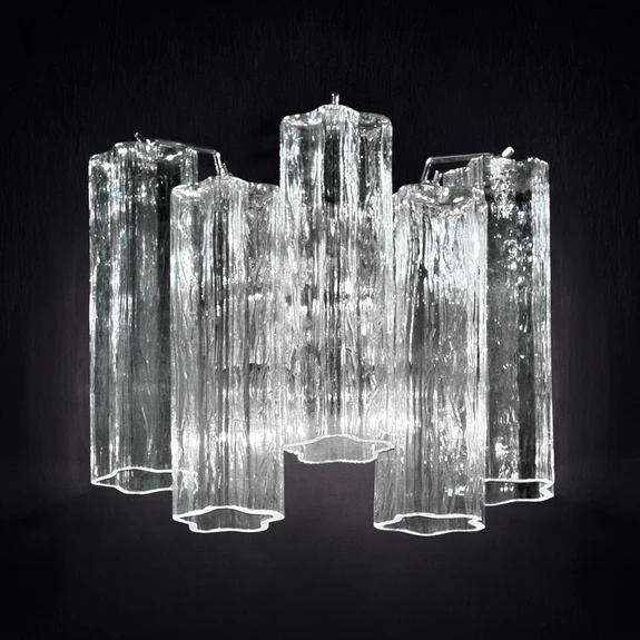 Spektakulær Tronchi-vegglampe med Muranoglass i transparent lookDen ekstraordinære Tronchi-vegglampen består av fem sylindere i Muranoglass med to lyskilder bak. Utseendet minner diskret om orgelpipene og den transparente strukturen i isformasjoner. Denne fascinerende armaturen er et blikkfang av høy kvalitet på veggen og gir et sterkt og effektivt lys. Tronchi er den ideelle tilleggsarmaturen til den stilrene stuen.