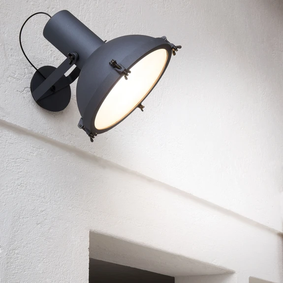 Projecteur 365 - justerbar vegglampe i tidløs design Projecteur 365-vegglampen briljerer med sine justeringsmuligheter, som oppnås takket være den vertikalt svingbare festeanordningen for skjermen på en brakett. Den låses på plass med vingeskruer, som også brukes til å feste dekselet og gir Projecteur 365 et industrielt preg. Takket være den ensfargede finishen og den enkle utformingen av skjermen som en halvkule med en sylindrisk forlengelse, kan vegglampen kombineres med mange ulike miljøer. Projecteur-serien ble designet av den sveitsisk-franske arkitekten Le Corbusier allerede i 1954. Den ble opprinnelig installert i hoffet i den indiske byen Chandigarh.