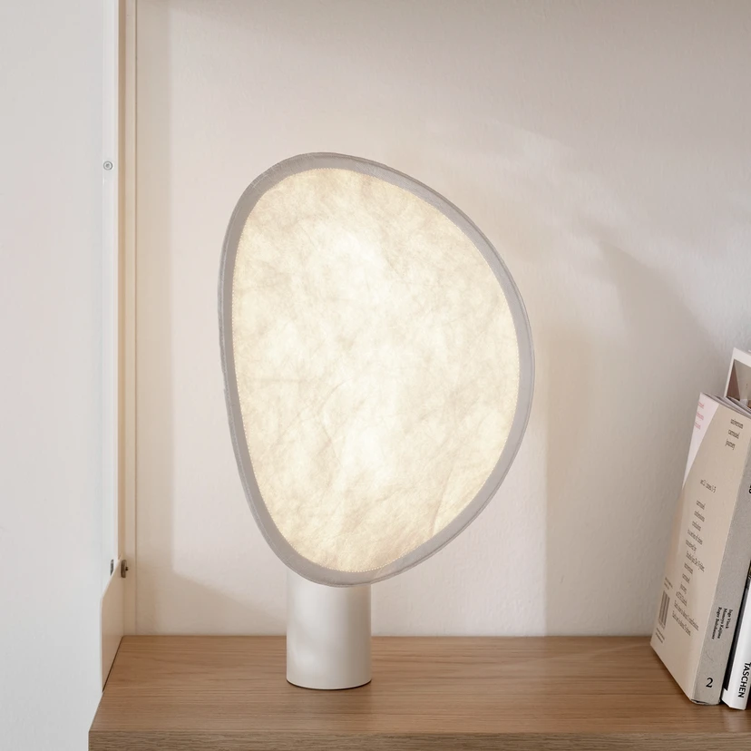 Dimbar, oppladbar LED-bordlampe Tense for innendørs bruk Den luftige, skylignende skjermen som kjennetegner pendellampen Tense fra New Works, er videreført i denne fascinerende bordlampen fra samme serie. Den flytende formen er laget av stramme karbonstenger og lett, slitesterk og 100 % resirkulerbar Tyvek, som er vasket for å skape den tiltalende krøllete effekten. Bordlampen står nesten loddrett på en strømlinjeformet fot, noe som gir god mulighet til å nyte den vakre teksturen i skjermen og den myke lysspredningen. Den batteridrevne armaturen kan enkelt flyttes dit det er behov for lys, og både fargetemperaturen og lysstyrken kan justeres for å tilpasses den ønskede stemningen. Ladingen skjer via en magnetisk ladekabel som passer sømløst inn i sokkelen og kan forbli der uten å forstyrre armaturens utseende.