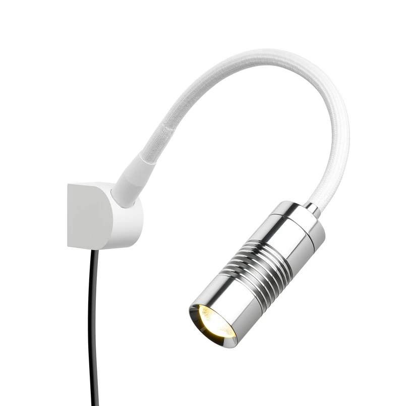 For utenpåliggende montering: LED-vegglampe Litt farge med fleksibel arm - forkrommet hode Denne vegglampen kan brukes på mange forskjellige måter i hele boligen. Den er utstyrt med en kabel med støpsel og kan brukes der det ikke finnes veggtilkobling for en armatur. Den bevegelige lysarmen og glasslinsen med fokuserbart lys (20-60°) gjør den til en fleksibel belysningsløsning for ethvert rom. Lysintensiteten kan justeres til ønsket nivå ved hjelp av den svært diskrete dimmerbryteren som er innebygd i armaturhodet. En minnefunksjon er integrert, dvs. at den siste innstillingen før den ble slått av lagres og hentes automatisk frem igjen når den slås på.