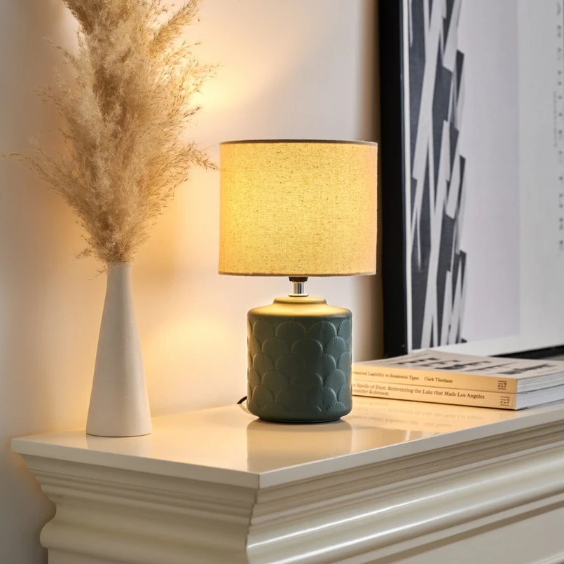 Sylindrisk bordlampe Glowing Midnight laget av tekstil og keramikk Sokkelen på bordlampen Glowing Midnight er håndlaget av fineste keramikk, dekket med mørkegrønn lakk. Den beige stoffskjermen danner en behagelig kontrast som gjør lampen til et spesielt blikkfang. Bordlampen Glowing Midnight skaper en hyggelig atmosfære på soverommet og i stuen. Inklusive støpselkabel med bryter.