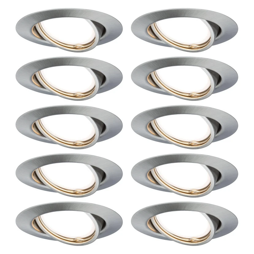 Innfelt spotlight Base i metall i et praktisk sett med 10 stk. Den lille innfelte spotlighten Base leveres i et sett med ti stk. og gjør det mulig å lage store belysningsinstallasjoner i hjemmet. Armaturhuset er laget av slitesterkt metall og inneholder en GU10-sokkel som du setter inn en lyskilde etter eget valg. Spotlighten kan svinges og tilpasses de romlige forholdene i en håndvending.