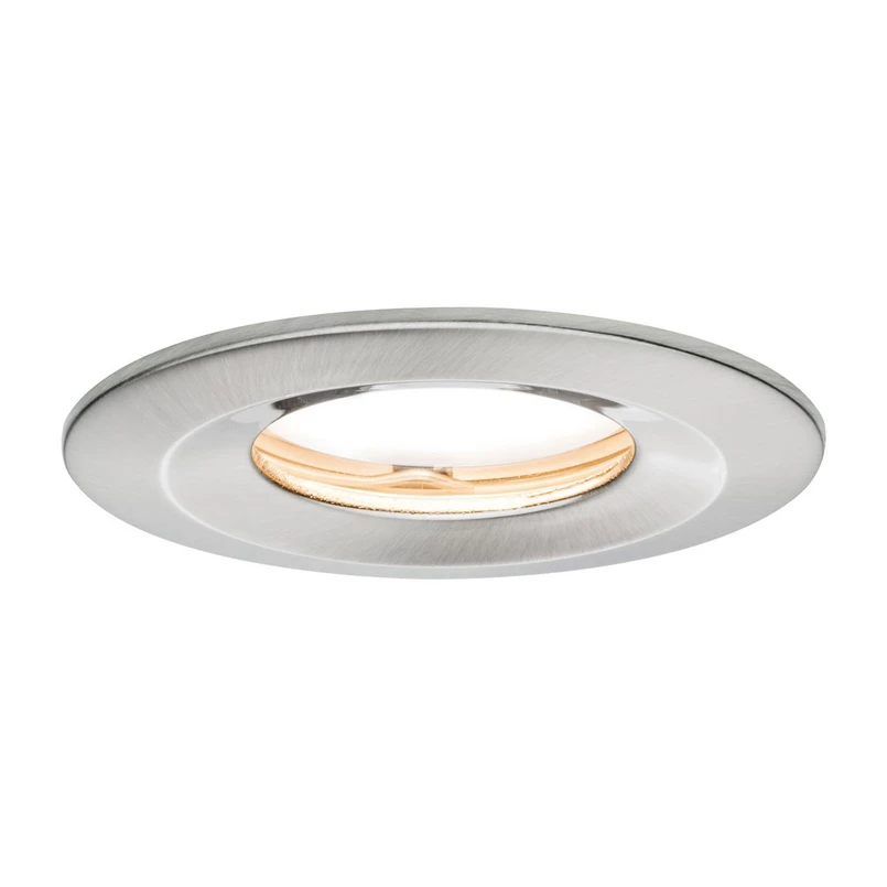 Premium LED-innfellingslampe Slim Coin - dimbar og med IP65-beskyttelse LED-innfellingslampe -innfelt lys Slim Coin er ideell for takbelysning, som også kan designes dekorativt med andre lys. Den har en rund form og har en enkel design med en børstet jernoverflate, som harmonerer perfekt med moderne fasiliteter. De innebygde LED-ene sender ut varmt hvitt lys nedover i rommet, men i kombinasjon med en faseavsnittdimmer kan lysstyrken varieres fra sterkt arbeidslys til feel-good-belysning. LED-spot er utstyrt med et beskyttelsesglass med sateng finish og IP65 beskyttelse mot vannstråler, slik at den også kan monteres på badet og andre fuktige rom uten problemer. Montering i tak er mulig uten verktøy, da det medfølger koblingsboks med dobbel hurtigklemme for sammenkobling. Takket være den flate konstruksjonen kan den også brukes i grunne hulrom.