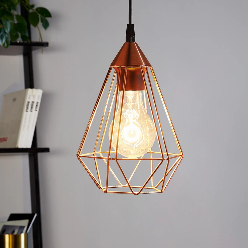 Tarbes-pendellampen med en flamme med vintage-utseende kan brukes til å belyse et sidebord i mange stilarter. Takket være den åpne, burlignende skjerm laget av kobberfargede metallstivere, kan lyset fra det anvendte lysstoffet (ikke inkludert) skinne uhindret i alle retninger; bare stagene skiller seg ut i omgivelsene gjennom fine skygger. En lyskilde med en klar glasspære og glødetrådslook har en veldig dekorativ effekt.