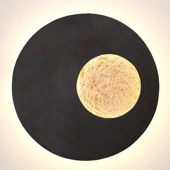 Planet - en imponerende LED-vegglampe i svart og gullDesignet på denne fascinerende LED-vegglampen Planet minner om to planeter som glir over hverandre, men i motsetning til dette skaper ikke vegglampen en sol- eller måneformørkelse, men en imponerende belysning med varmhvitt lys. LED-lampene er montert på utsiden av det runde, mattsvarte elementet og i den lille runde fordypningen, noe som gir en unik lyseffekt og får den gylne innsiden av armaturen til å fremstå svært tydelig.lysfargen til de ytre LED-lampene er 2700 kelvin, mens lysfargen til de indre LED-lampene er 3000 kelvin.