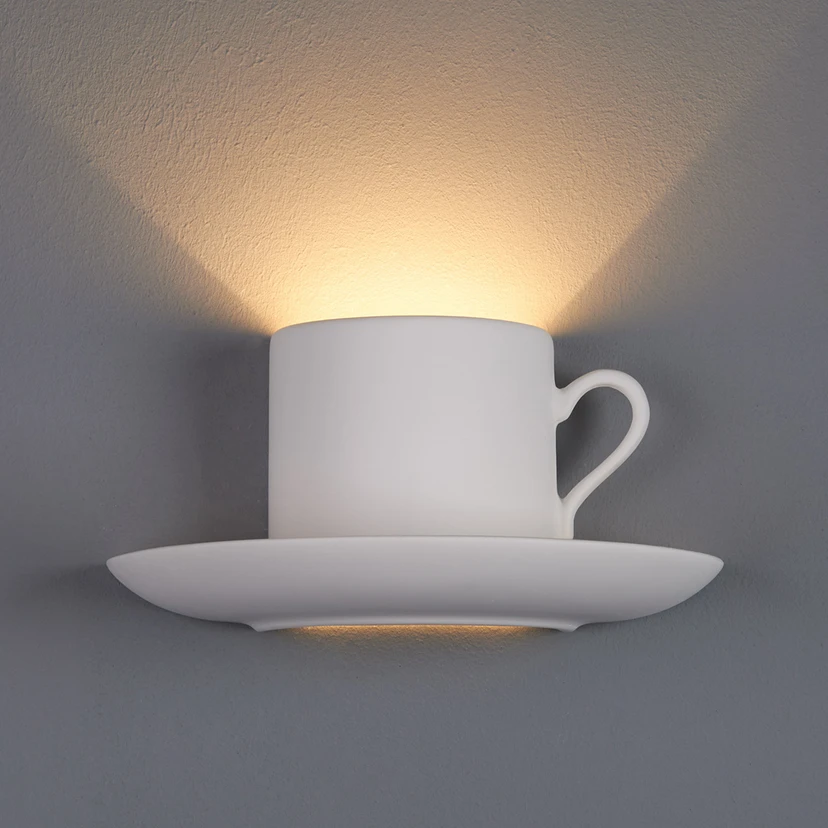 Vegglampen Pocillo blir et spesielt blikkfang i rommet med sin uvanlige design Det tar ikke lang tid å forstå hva denne riktignok uvanlige lampen skal forestille: en kopp. Og det er ikke kaffe eller te, hvis stimulerende duft kommer ut fra toppen som varm damp, men denne spesielle koppen er full av lys. Du kan riktignok ikke drikke den, men ideen bak er en flott og svært effektiv måte å kombinere belysning med dekorative aspekter på. Vegglampen er en vakker lyskilde i private hjem, spesielt på kjøkkenet og i spisestuen. Men det er ikke bare her armaturen egner seg spesielt godt, nei, Pocillo er absolutt en hit i serveringsbransjen også, for eksempel når den monteres over en bardisk eller rett og slett på veggen i en kafé. Da er mottoet ganske enkelt: Sett deg ned, føl deg vel, opphold deg, vent og ... drikk te! Og hvis det ikke er nok for deg, kan du også male vegglampen i hvilken som helst farge du vil, slik at den passer perfekt til den eksisterende atmosfæren eller rett og slett pryder rommet som et iøynefallende dekorativt tilbehør. Lampen leveres som standard med sandpapir og hansker for å kunne gjennomføre en slik kreativ designprosess.
