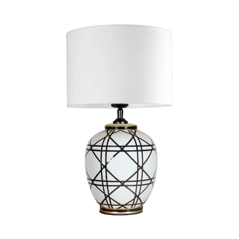 Bordlampen New York kombinerer tidløs eleganse med funksjonelt design. Den høykvalitets keramiske sokkelen med grafisk mønster i kombinasjon med en stilig stoffskjerm setter målrettede aksenter og passer perfekt inn i forskjellige oppholdsrom som stue, soverom eller spisestue. Den harmoniske fargekombinasjonen i svart og hvitt understreker allsidigheten og gir et diskré, men likevel uttrykksfullt utseende.