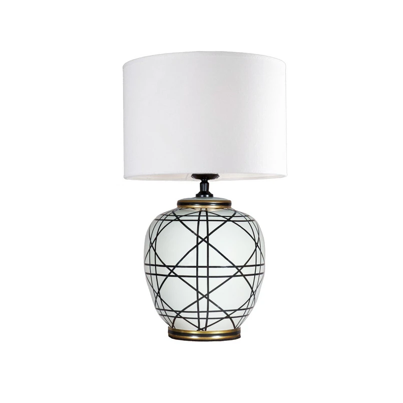 Bordlampen New York kombinerer tidløs eleganse med funksjonelt design. Den høykvalitets keramiske sokkelen med grafisk mønster i kombinasjon med en stilig stoffskjerm setter målrettede aksenter og passer perfekt inn i forskjellige oppholdsrom som stue, soverom eller spisestue. Den harmoniske fargekombinasjonen i svart og hvitt understreker allsidigheten og gir et diskré, men likevel uttrykksfullt utseende.