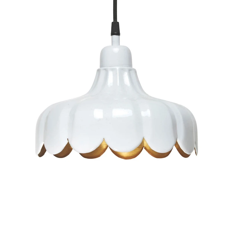 Wells pendellampe med metallskjerm i blomsterlook, utstyrt med støpsel Wells pendellampe består av et tekstiloppheng og en metallskjerm med gullfarget innside. Skjermen er laget for hånd og har et blomstermønster. Den gir et romantisk preg til stuen og er samtidig et vakkert dekorativt innslag. Den gullfargede innsiden reflekterer lyset og gir et spesielt varmt skjær. Pendellampen Wells er perfekt til å lyse opp for eksempel stuebordet, spisebordet eller kjøkkenbenken. Lyskilden er ikke inkludert og kan velges fritt. Strømtilførselen skjer via stikkontakten takket være den lange ledningen.