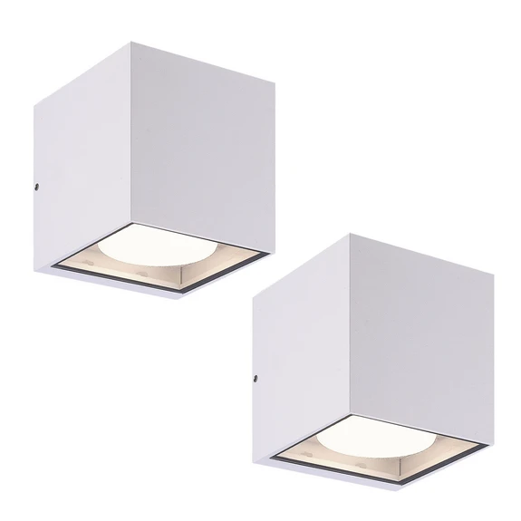 Hvit utendørs vegglampe Tetje i kantet aluminium og praktisk sett med 2 stk. Tetje er en robust følgesvenn for uteområder. Den utendørs vegglampen er laget av aluminium og har en robust karakter takket være kapslingsgraden IP65. Denne kapslingsgraden gjør den støvtett og beskytter den mot vannstråler. Den hvite fargen er enkel og integreres uanstrengt i husets arkitektoniske stil. Den utendørs vegglampen Tetje genererer blendingsfri belysning fordi den omgir lyskilden. Den kan utstyres med to GX53-pærer og leveres i et praktisk sett med 2 stk.