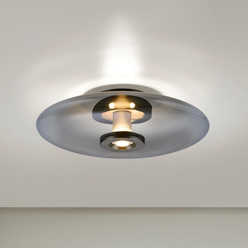 Vitrum LED-taklampe med linseformet lampeskjerm i glass - eksternt dimbar Vitrum-taklampen er en moderne lyskilde for stuer og salonger. To varmhvite LED-tavler er integrert i den runde aluminiumskroppen og sender lys oppover og nedover for å gi direkte og indirekte belysning. Lampen har også en lampeskjerm i glass med flat linseform. Ved behov kan lysstyrken styres eksternt ved hjelp av en dimmer.