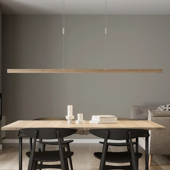 Dimbar Nora LED-stangpendel i eiketre av høy kvalitet - CRI > 90 Tre er et materiale som kan kombineres med mange ulike stiler, passer inn i alle miljøer og gir et naturlig preg i stuen. Den skandinaviske designtrenden tar opp i seg naturlige farger og materialer og setter treet i sentrum som en sentral komponent. Nora LED-pendellampe er laget av massivt eiketre og følger dermed den skandinaviske boligtrenden. Pendellampens langstrakte lyskropp trenger ingen utsmykning eller forseggjorte detaljer for å bli spisestuens midtpunkt. Nora er en enkel og stilren trebjelke med integrert LED-belysning, og den treffer absolutt blink. Lampekroppen er laget av massiv eik og er formet for hånd. I undersiden av bjelken er det støpt inn et aluminiumsrør som rommer LED-lampene. For å oppnå en vellykket dybdeeffekt når lyset faller inn, er det arbeidet inn en faset kant i treverket i området rundt lysuttaket. En spesiell matt lakkering, som også gir treet det typiske utseendet til naturlig, oljet ekte tre, sørger for at det er ufølsomt for berøring. Et sofistikert kabeltrekk sørger for at pendellampen kan justeres trinnløst i høyden. Det betyr at Nora kan henges opp i alle høyder mellom minimum 105 cm og maksimum 195 cm. Lysstyrken på de integrerte LED-lampene kan om ønskelig justeres ved hjelp av en fasedimmer i forkant eller bakkant. Denne tyskproduserte LED-pendellampen kan brukes i alt fra rustikke til klassiske og moderne innredningsstiler - med sin naturlige og stilrene design passer den inn i ethvert miljø.