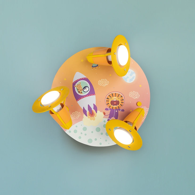 Taklampe til barnerommet Escape med tre bevegelige spotlights Den fantasifullt utformede taklampen Escape har et takpanel i tre med et flott, barnevennlig motiv. Sjiraffen og pingvinen sitter i raketten, og den modige løven går rundt på en planet i romdrakten sin. Hvem vil vel ikke være med på ferden og oppleve store eventyr? Selve taklampen er utstyrt med tre bevegelige spotlights som lyser opp alle hjørner av rommet og sørger for tilstrekkelig grunnbelysning på barnerommet.