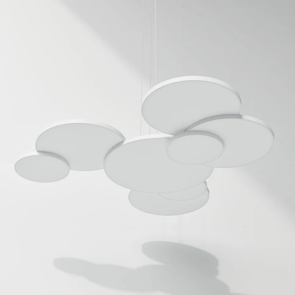 LED designerpendel Overlap i skiveform Denne pendelen i aluminium og MDF lettvektsfiberplate er et kreativt og allsidig blikkfang fra designeren Paolo Dell'Elce. Overlap består av overlappende skiver i ulike størrelser. Disse er festet til hverandre slik at de kan roteres og plasseres etter behov. Også baldakinen har samme form som skivene. Det største, sentrale elementet bærer LED-lyskildene på oversiden, som kan dimmes ved hjelp av en egnet veggbryter. Ved å lyse opp taket gir Overlap en passende omgivelsesbelysning for moderne stuer og oppholdsrom av høy kvalitet.
