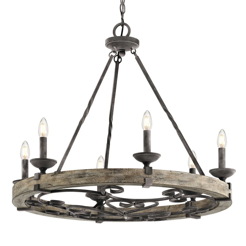 Denne rustikke lysekronen Taulbee gir ikke bare rikelig med lys, men også historisk preg. Lysekronen passer både til kjøkkenet og til soverommet, stuen eller gangen. Trekransen med grålig pigmentering skaper en middelaldersk atmosfære.