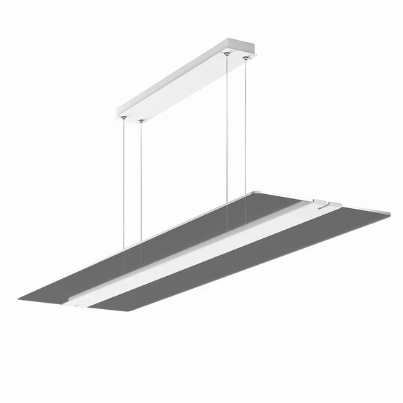 Flat Twindot S LED-pendelarmatur med direkte og indirekte lys, DALI-dimbar Twindot S LED-pendelarmatur gir et homogent arbeids- og omgivelseslys på moderne kontorer. Den imponerer med sin ekstremt flate design. Sentrallisten av hvit pulverlakkert, ekstrudert aluminiumsprofil har en lysleder av klar, UV-bestandig akryl på begge sider. Denne er utstyrt med Twindot prismeteknologi som gir en behagelig myk lyseffekt med myke skygger og minimal blending (egnet for skjermarbeidsplasser i henhold til DIN EN 12464-1). Lyset avgis 45 % indirekte og 55 % direkte - God avblending: UGR < 19 - Forkoblingsutstyr (DALI) integrert i den rektangulære baldakinen - Inkluderer 4-punkts oppheng med rustfrie stålkabler (pendelens lengde kan justeres fra 50 til 120 cm før montering) - Omgivelsestemperatur under drift: - 20 °C til + 45 °C - Slagfasthet: IK03
