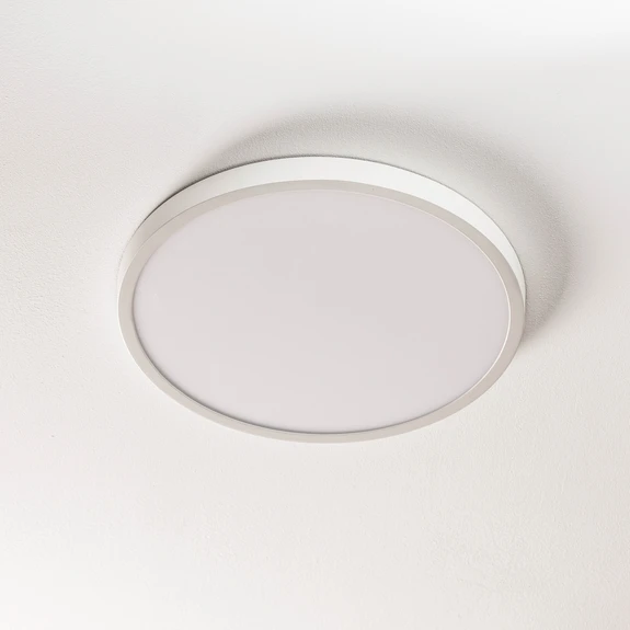 Rund Lero LED-takarmatur med lav konstruksjonshøydeDen svært flate Lero LED-takarmaturen med aluminiumsramme og opal matt plastdeksel er ideell for belysning av stuer, korridorer og oppholdsrom i interiør med moderne møbler med sin bredt diffuse lyseffekt. På grunn av den lave installasjonshøyden er takarmaturen også det ideelle valget i områder med lave romhøyder.De integrerte LED-lampene avgir varmhvitt lys og gir en høy lyseffekt som kan dimmes eksternt via faseseksjonen.