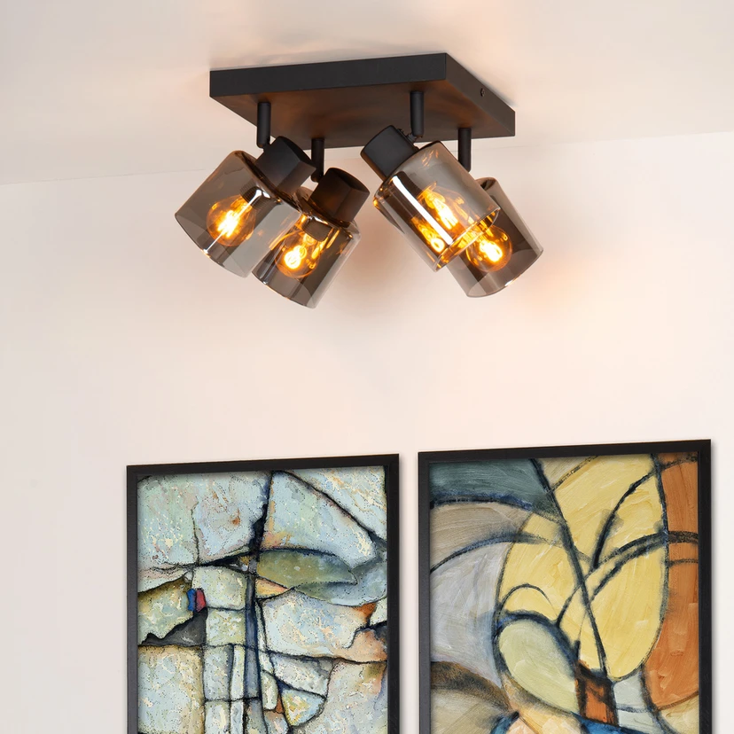 Alion takspotlight med fire lamper og glasskjermer De fire glasskjermene i Alion takspotlight er plassert på en kantet metallbaldakin og gir lys der du trenger det. Skjermene kan justeres individuelt og inspirerer med sitt røykgrå, men likevel diskret transparente utseende som skaper spennende lyseffekter.