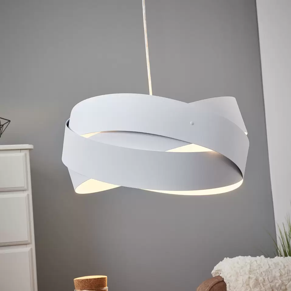 Designet til denne hengende lampen kombinerer tidløs eleganse og moderne design. Den består av en rund takfeste og et 100 cm langt oppheng som lampeskjerm er festet til. I likhet med takfeste og stangen består denne av hvitlakkert metall, som gir det generelle utseendet en viss letthet. Pendellampen egner seg først og fremst til å belyse bord eller benker. Lyskilden som skal brukes er tilgjengelig som tilbehør.